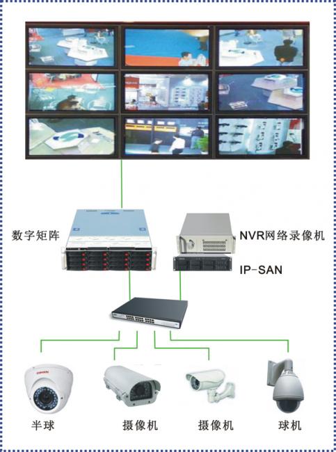 矩陣切換系統(tǒng):在一臺(tái)監(jiān)視器上依次切換顯示多個(gè)攝像機(jī)的圖像,可以進(jìn)行重點(diǎn)的切換畫面顯示,切換時(shí)間可以調(diào)整。即使攝像機(jī)數(shù)量增加,監(jiān)視器也不必增加,所以該系統(tǒng)可以節(jié)約成本,非常經(jīng)濟(jì)。